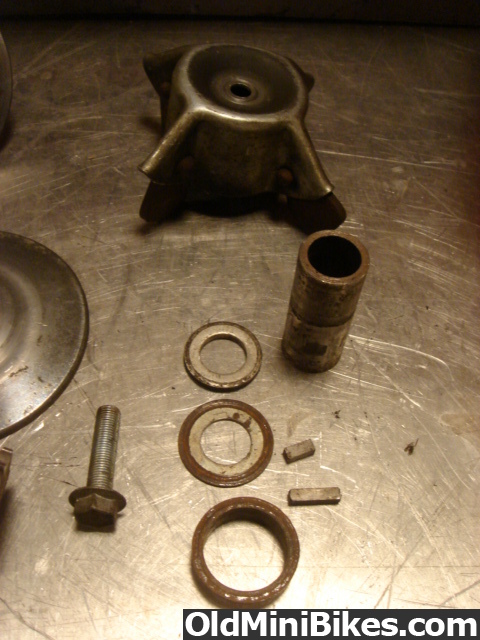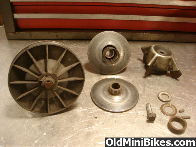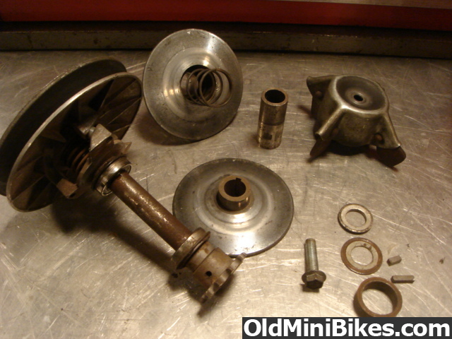 Here's a complete RUPP TAV setup just as it was pulled from a running '70 RUPP Roadster. All the original parts and pieces are there incuding the sleeves, spring, spacers, washers, retaining bolt.....even the little keys. Slight wear on the bottom of driver sheaves ...the driven pulley and jackshaft assembly looks perfect.The small sprocket on the end of the jackshaft shows wear to the teeth but that's an easy replacement....jackshaft bearings are also there.