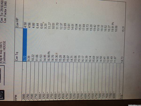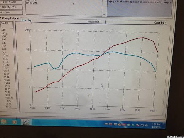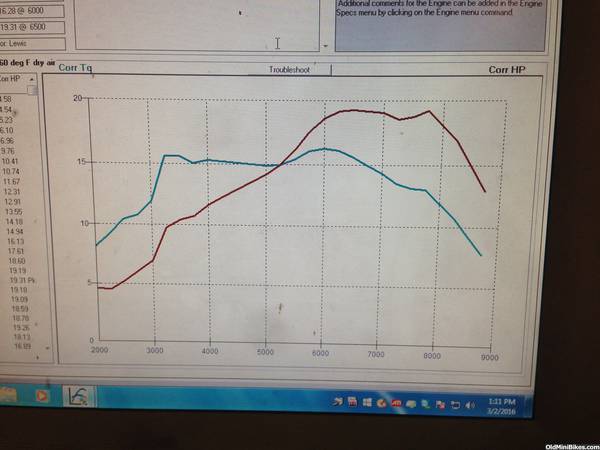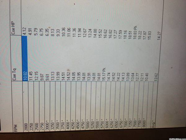 Second motor my little red clone . Parts Honda flat top piston , Honda side cover and billet rod and a PVL flywheel .cam dyno 308 with champion rockers Honda lifters and chromoly push rods . The head is a Honda 18 cc milled 50 thousand and it got one of my best port jobs to date along with stainless stock size valves . Carb 22mm mikuni that we had some problems with but still came though , had to go down in jet size and he said it still wasn't 100 percent . But dyno time cost me money so we stopped with the second pull .