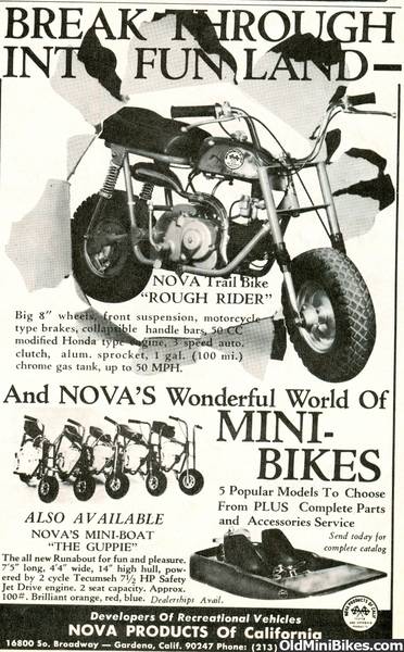 The Nova "Ruff Rider" came out in 1970. This ad shows there first prototype in 1969 with the Honda 50cc push rod hemi engine and a 3 speed transmission. Also was made available (so the ad says LOL) with a 100cc push rod hemi honda engine and a 4 speed or 5 speed trans..