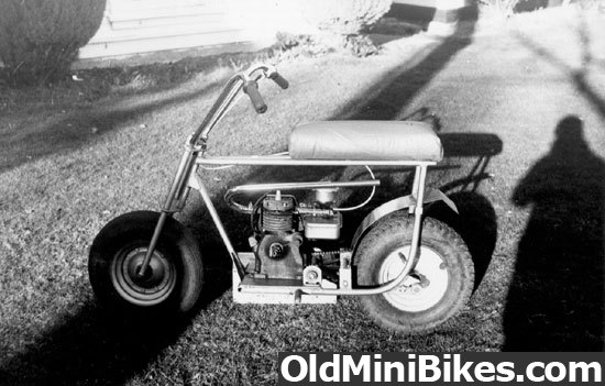 I didn't have $150, not even close... so I decided to make my own mini-bike. I heard about a frame for sale, and got a bit excited. When I saw it, the construction was crude, and it was quite unsuitable, so I decided to make my own. I drew a full size sketch on cardboard, and started assembling components. The engine was a 2.5hp Clinton, and the front wheel was off a wheelbarrow. The tubing was pipe, but it was free. My father borrowed a pipe bender from work, and we bent the tubes in the back yard on the lawn. I had no workshop then.