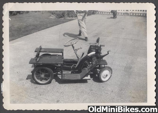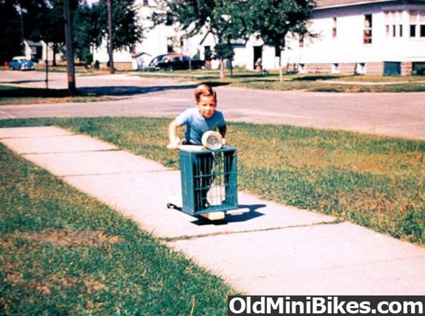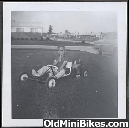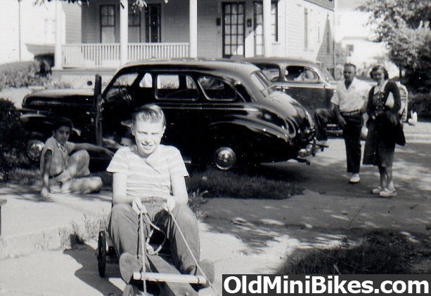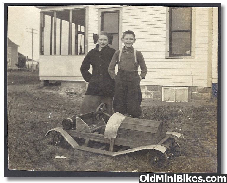 "This first picture here taken in 1953 shows Jim and Paul Finlay behind their home with their push mobile(Jim is the pusher) built from orange crates and sporting the famed Barry Kettering #47.