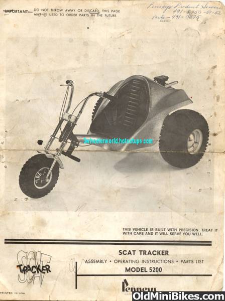 Both trikes were made by the CAT Muskin corp...they used a slightly different body style on the Scat Trackers they sold through JC Penny but it is essentially the same machine. I think the Scat Trackers also came with 5 HP Briggs ..looks like yours has an older big block Tecumseh flathead in it. Notice how your fender has a crack in the exact same spot as mine...very common.